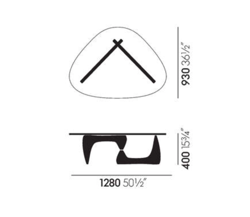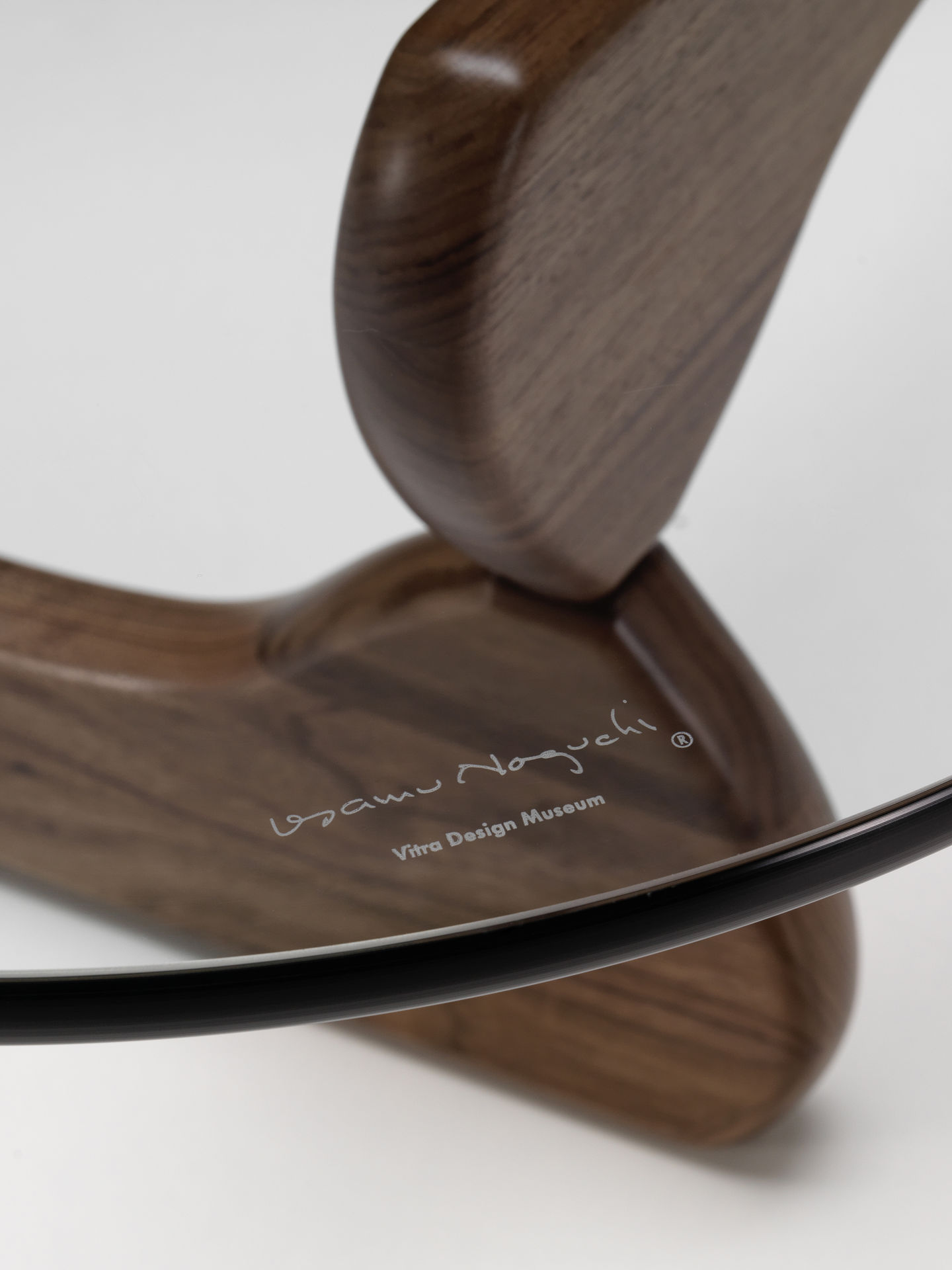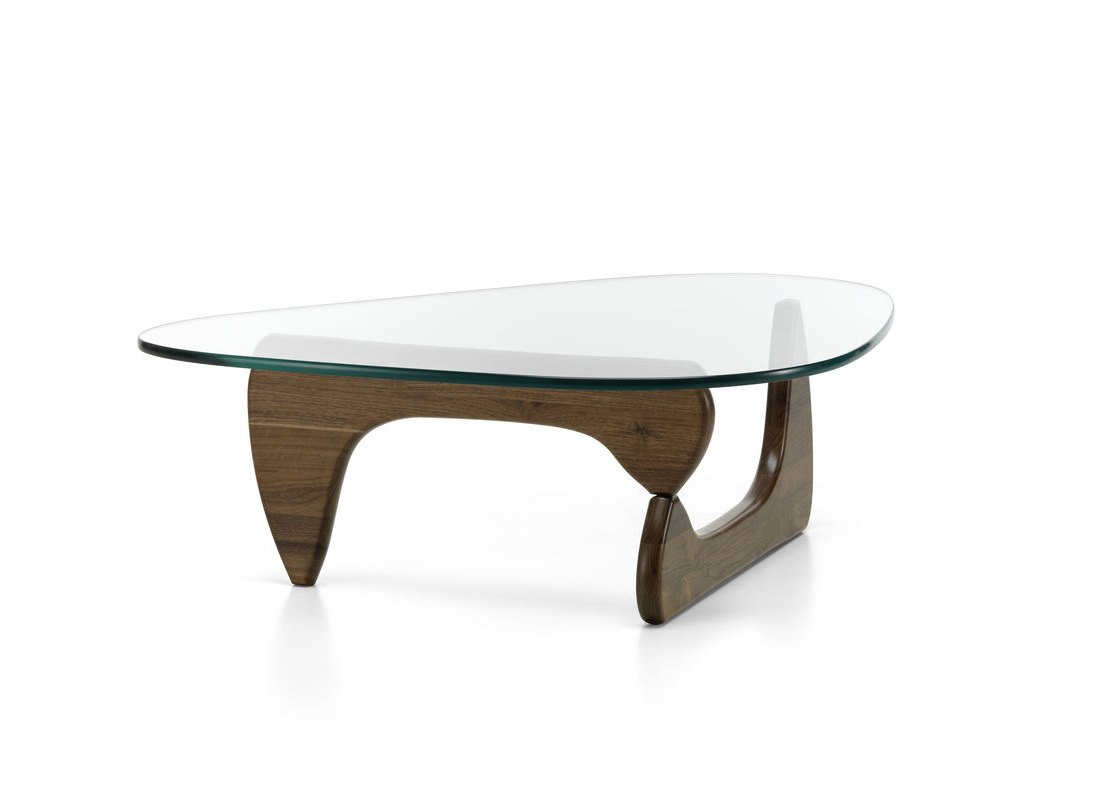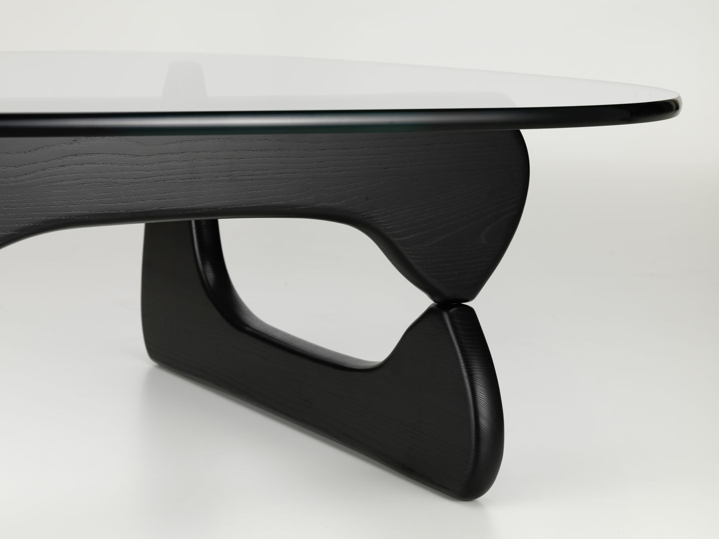 Der Coffee Table übersetzt die biomorphe Formensprache der Plastiken des Bildhauers und Designers Isamu Noguchi in einen skulpturalen Couchtisch. Wohl deshalb nannte Noguchi selbst den Tisch seinen besten Möbelentwurf. Zwei im rechten Winkel zueinander stehende Holzbeine, die in schwarzer Esche, Ahorn und Nussbaum erhältlich sind, tragen die schwere, robuste Glasplatte.
