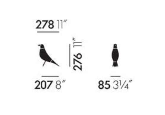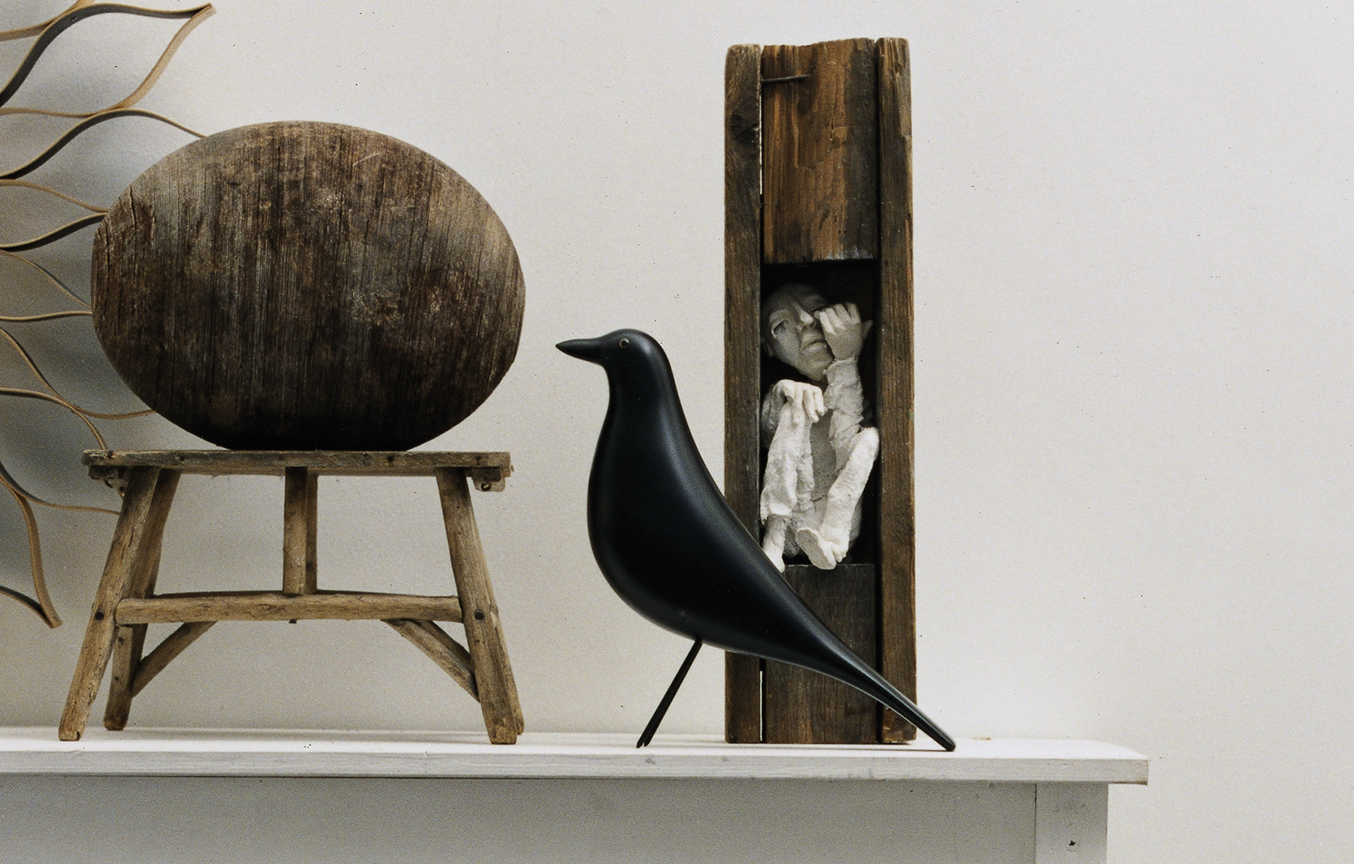 Charles und Ray Eames bereicherten die Collage in ihrem Eames House mit zahlreichen Objekten und Accessoires, die sie von ihren Reisen mitbrachten. Im Zentrum des Wohnraums steht seit über siebzig Jahren eine Vogelfigur aus Holz auf dem Boden – offensichtlich ein von Charles und Ray besonders geschätztes Stück, welches sie auch häufig als Accessoire in ihren Fotos eingesetzt haben.