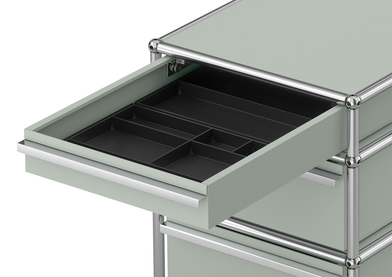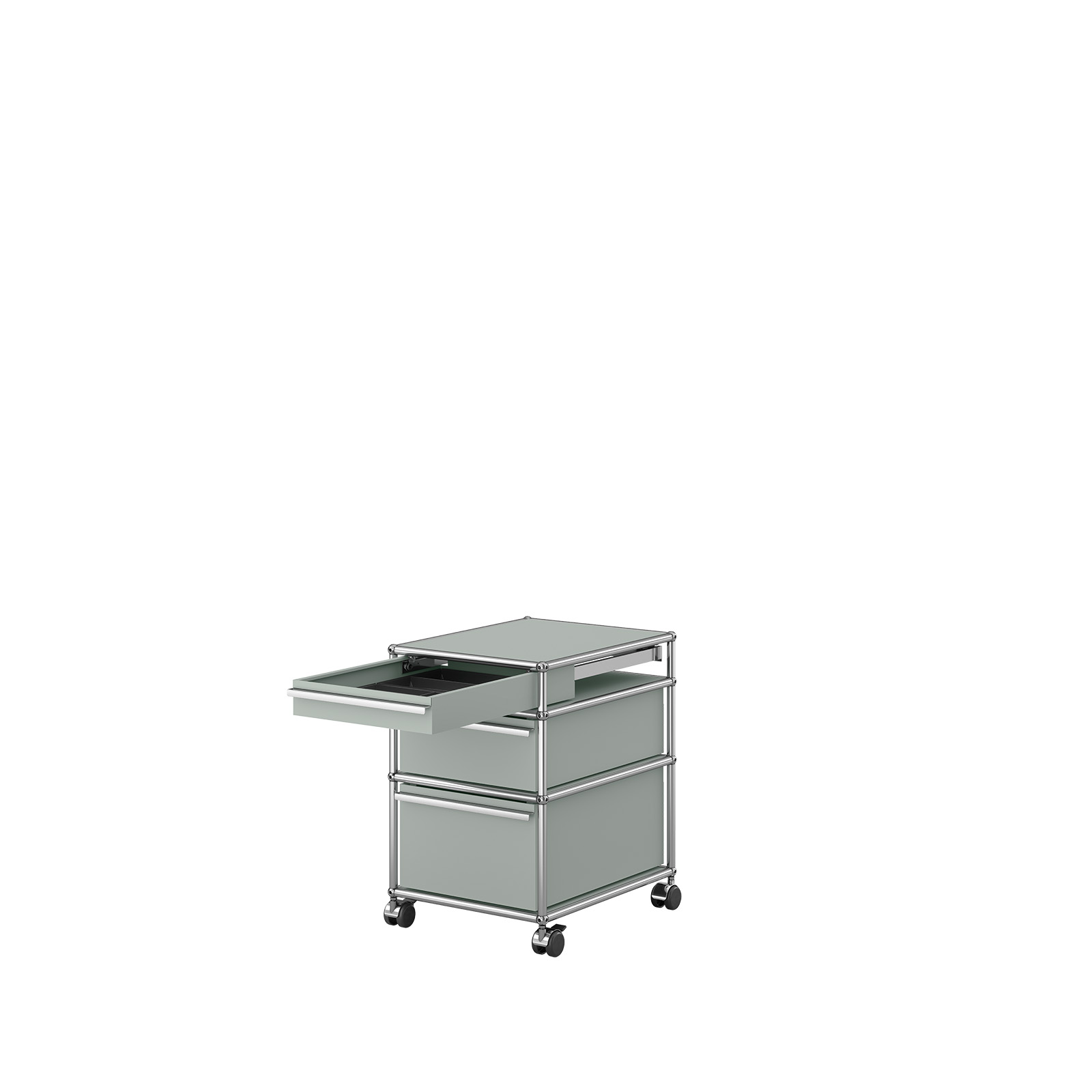 USM Haller Rollcontainer mit drei Schubladen (100/175/250 mm hoch), zwei Ineos Schalen mit Einleger, Gegengewicht sowie Rollen mit weicher Lauffläche, davon zwei arretierbar